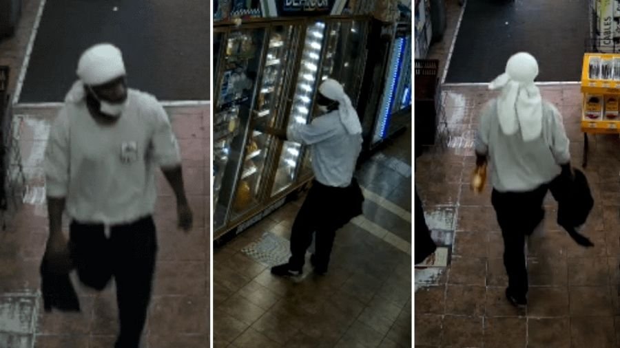 - Authorities are seeking a Black male suspect, aged 20-30, approximately 5'6" tall with a slim build, who was wearing a white t-shirt as a head covering, a white face mask, a white long-sleeve shirt with a rectangular logo, black sweatpants, and black athletic shoes.